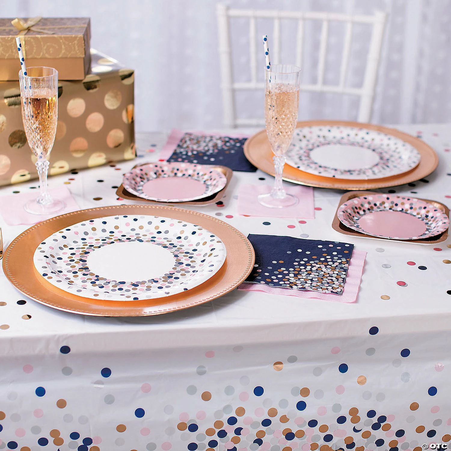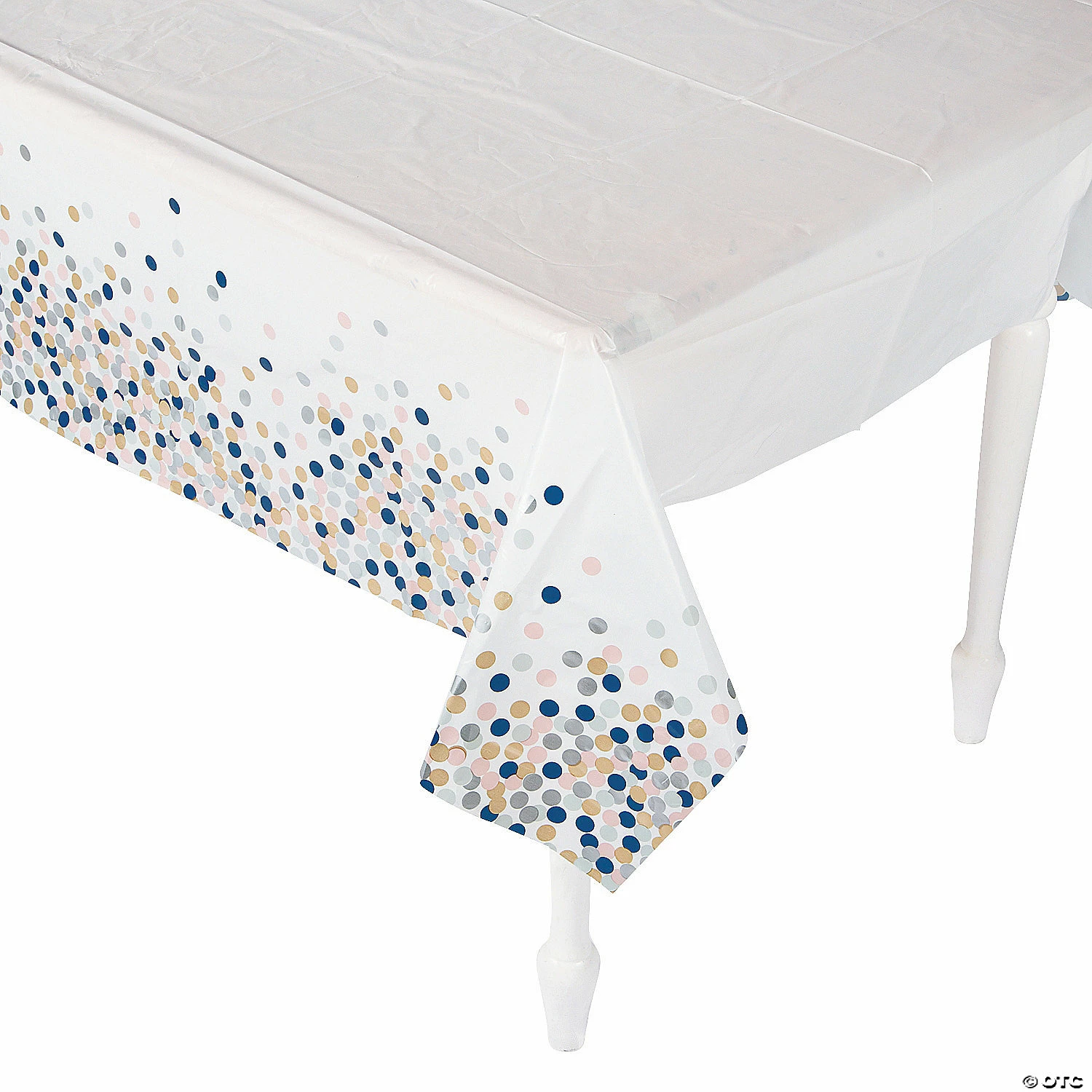 Sprinkled with style for your dotted décor, this durable tablecloth is a fashionable way to decorate for DIY weddings. This tablecloth instantly adds a simple chic style to birthday parties, bridal showers, bachelorette events and more. Add to this to your party supplies, then mix and match with other confetti-design tableware for a totally unique celebration. © OTC• Plastic.• Thin, slightly transparent.• Disposable.• 54″ x 108″
